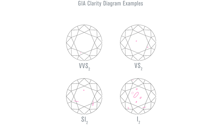Clarity measures the amount, size and placement of internal ‘inclusions’ and external ‘blemishes.’ Inclusions include small crystals or fissures within the diamond. Blemishes include chips. Diamonds with grades down to VS2 (Very Slightly Included) or SI1 (Slightly Included) do not typically have eye-visible inclusions. These diamonds can be good value. Diamonds I1 (Included) or lower have inclusions that are easily seen and can appear less attractive; some of these inclusions might also impact the diamond’s durability.