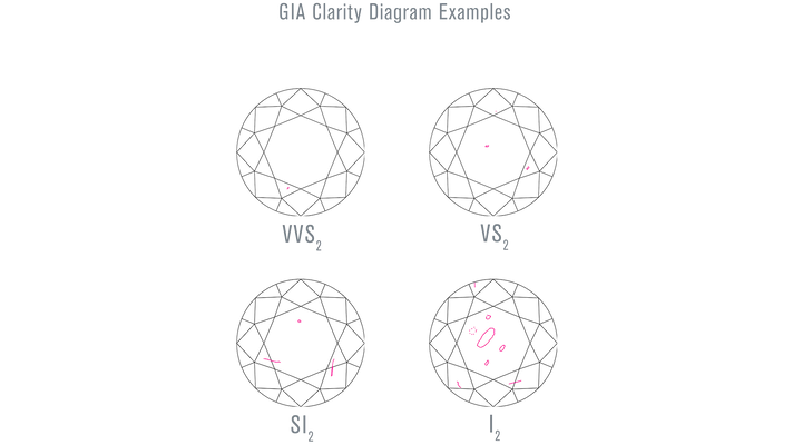 Clarity measures the amount, size and placement of internal ‘inclusions’ and external ‘blemishes.’ Inclusions include small crystals or fissures within the diamond. Blemishes include chips. Diamonds with grades down to VS2 (Very Slightly Included) or SI1 (Slightly Included) do not typically have eye-visible inclusions. These diamonds can be good value. Diamonds I1 (Included) or lower have inclusions that are easily seen and can appear less attractive; some of these inclusions might also impact the diamond’s durability.
